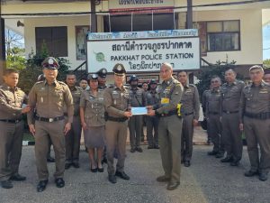 – ได้เลี้ยงอาหารกลางวัน ก๋วยเตี๋ยว ไอศกรีม และได้มอบเงินเพื่อเป็นขวัญและกำลังใจให้แก่ข้าราชการตำรวจ สภ.ปากคาด