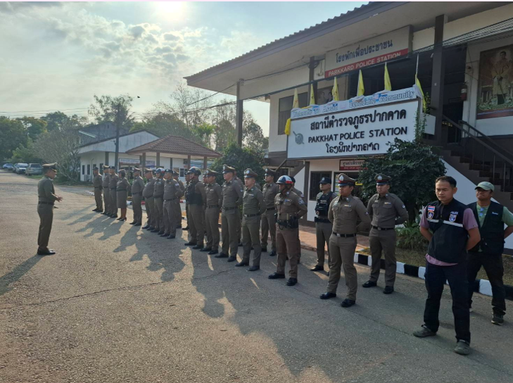 ผกก.สภ.ปากคาด นำข้าราชการตำรวจ สภ.ปากคาด รวมแถวตรวจจำนวนเคารพธงชาติ สวดมนต์ไหว้พระ กล่าวปฏิญาณตน ตรวจทรงผม เครื่องแต่งกาย และมอบนโยบายข้อสั่งการ ขับเคลื่อนการทำงาน และนโยบายข้อสั่งการอื่นๆ จาก ตร.,บช. และ บก.